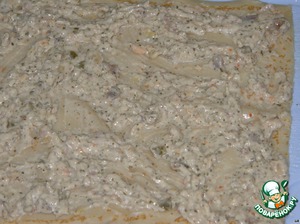 На разложенный тонкий блинчик наносим нашу "намазку", но не до конца, оставим полоску в 1 см., чтобы потом можно было его свернуть в рулетик.