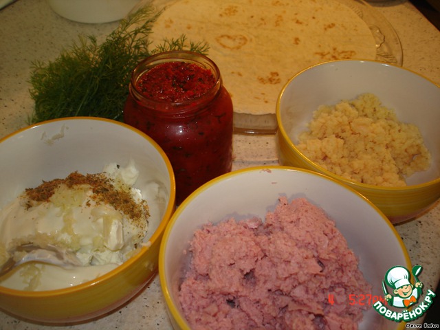 Промазать первый лаваш ветчиной с сыром и майонезным соусом,