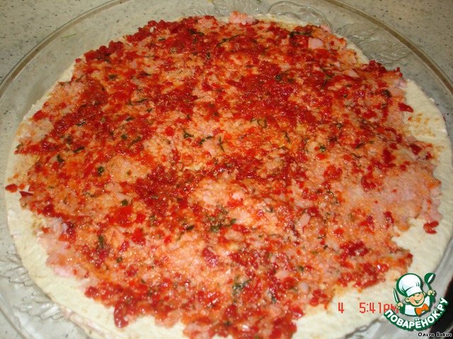 Перемолотый перец с чесноком и специями наносим на 2-й лаваш с ветчиной и сыром (в этом случае можно заменить перец на кетчуп)