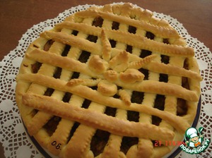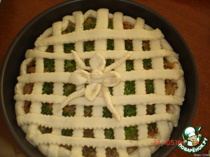 уложить начинку, присыпать зеленью и уложить тонкие полоски из теста сверху.