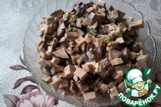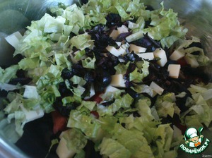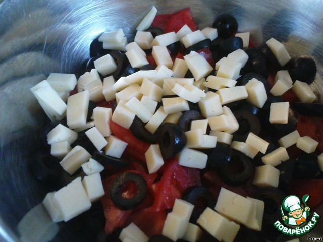 • Оливки нарезаем кружочками, сыр мелкими кубиками