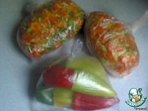 Даём нашему перчику просушиться немного от лишней влаги (чтобы не держать эту влагу в морозилке), приблизительно 1-2 часа. Укладываем в полиэтиленовые пакеты, прочно завязываем (можно в двойной пакет) и укладываем в морозилку. У кого есть-включаем режим быстрой заморозки на 1-2 часа. Всё! Лёгкая готовка зимой обеспечена! Можно укладывать в пластиковые контейнеры, но мне кажется пакеты более лучше укладываются в набитую морозилку.