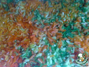 Перец болгарский разных цветов моем, очищаем от семян и плодоножек и режем мелкими ломтиками, кубиками и другими способами - кому как нравится. Получается вот такая мозаика!