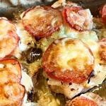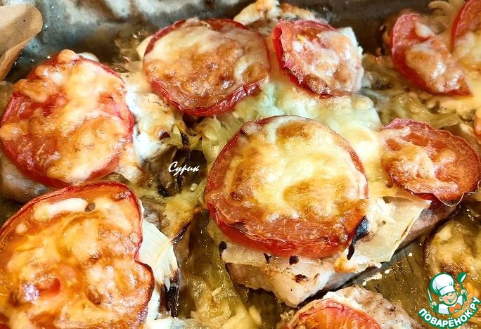 Мясо, обмакнув в льезон, обжарить с двух сторон как обычные отбивные. Выложить на противень, сверху кольцами разложить лук, помидор и посыпать сыром. Отправить в духовку до готовности.