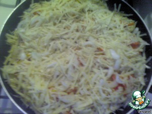 Посыпаем наше блюдо (по желанию)болгарским перцем мелко резанным , сверху посыпаем смесью из сыра,лука и чеснока. Отправляем всё это обратно в духовку на 30 минут допекаться.