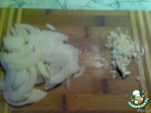 Мелко режем чеснок, лук репчатый режем полукольцами. -