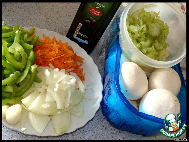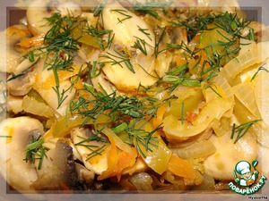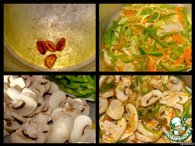 и закладываем в ароматизированное масло овощи и крупно нарезанные грибы.