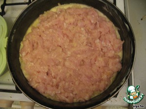 • 6. Мажем форму маслом, выкладываем первый слой - ПЮРЕ + половина лука зажаренного