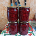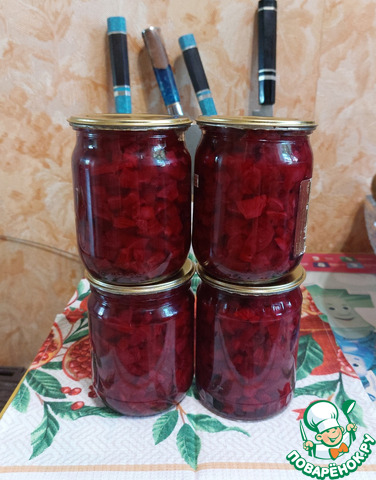 Залить этим маринадом свеклу в банках и сверху добавить в каждую банку по 1 ст. л. уксуса. Стерилизовать 15 - 20 минут и закатать.