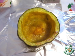 У тыквы отрезать "крышечку" с хвостиком, выбрать семена. Аккуратно ложкой, чтоб не повредить корку,