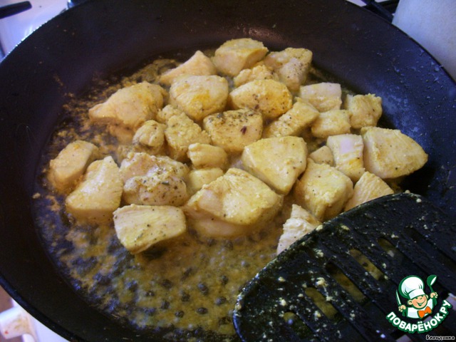 Тем временем готовим начинку. Куриное филе режем кусочками и обжариваем на сковороде с разогретым маслом до полуготовности,