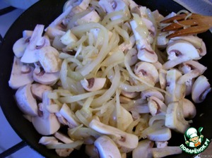 Лук режем полукольцами, а грибы примерно на 8 частей, обжариваем сначала лук, затем к нему добавляем грибы (также обжариваем до полуготовности).