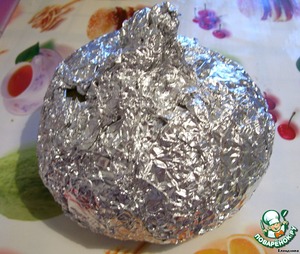 Закрываем "крышкой" и заворачиваем в фольгу (хвостик у крышки тоже нужно обернуть, иначе сгорит). И отправляем нашу конструкцию