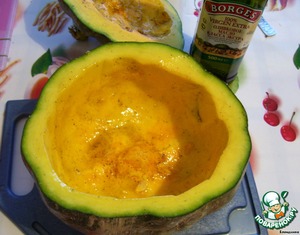 Натереть тыкву изнутри чесноком, посолить, поперчить и смазать оливковым маслом. Отправляем тыкву и "крышку" в разогретую духовку на 30 минут.