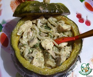 Отличный осенний обед- сочная начинка из традиционного дуэта курицы и грибов и необычный съедобный "горшок" из тыквы, пропитанный ароматным соком... Стоит попробовать!