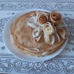Нужно вырезать ровный круг внутри блина, из малого круга вырезать листики, а из окантовки скрутить розы.