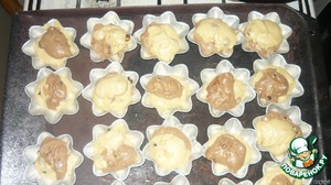Формочки смазать маслом и выкладывать тесто (тесто с какао и обычное тесто) -