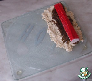 На край листа выложить немного начинки из плавленного сыра и слегка примять