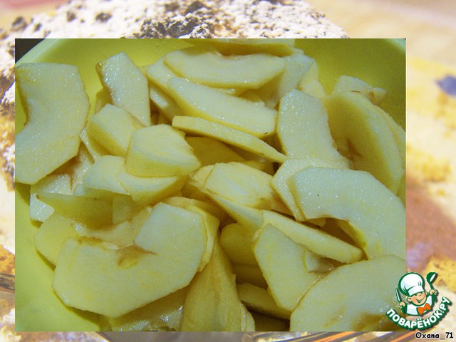 Смешиваем яблоки с 50 гр сахара и 1-2 ст. ложки бренди или коньяк (можно также и ром). Отставляем на 15 минут. -