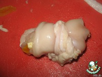 Кладём на пластинку филе немного чеснока, сыра и кураги. Заворачиваем рулетиком. |