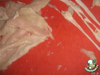 Грудку нарезать тонкими пластами. Кожицу нарезать длинными полосками. Количество пластинок филе и полосок кожицы, должно совпадать. Филе посолить и поперчить - по вкусу. |