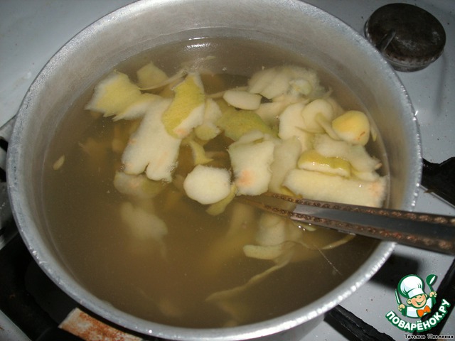 В воду, в которой мы бланшировали айву, добавляем сахар, шкурки и сердцевинки варим еще минут пять. Возможно вся вода не понадобится.
