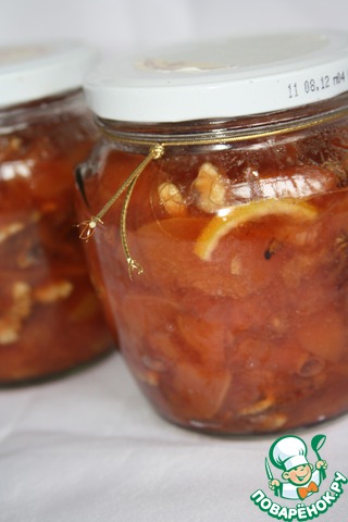 Снятую кожуру залить 1 стаканом воды, варить 10-15 минут. Процедить и отставить, а добавить в варенье перед последней варкой, вместе с грецкими орехами.