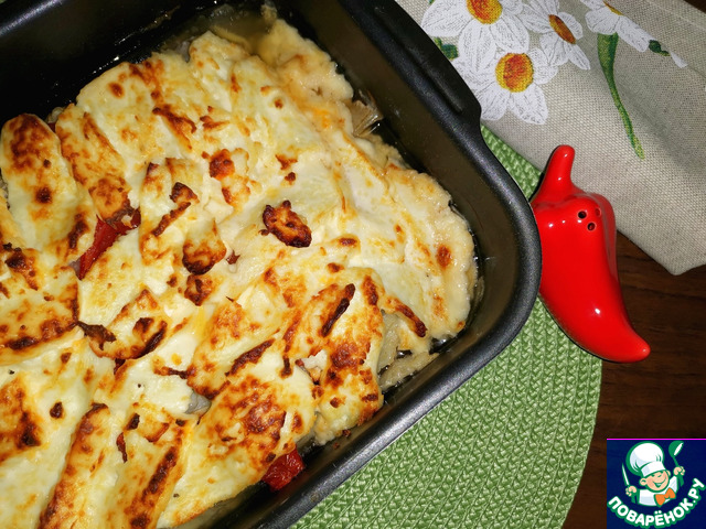 4. Вынуть, посыпать натертым сулугуни и отправить обратно в духовку под гриль, чтобы сыр расплавился и сделался золотистым.