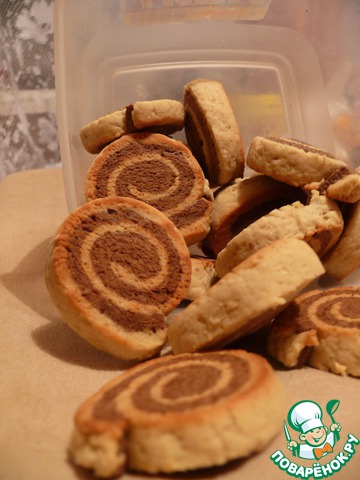Светлое тесто раскатать в квадрат. Тeмное тесто раскатать в такой же квадрат. Переложить тeмное тесто на светлое, свернуть рулет и на 15 -20 мин. - в морозилку.