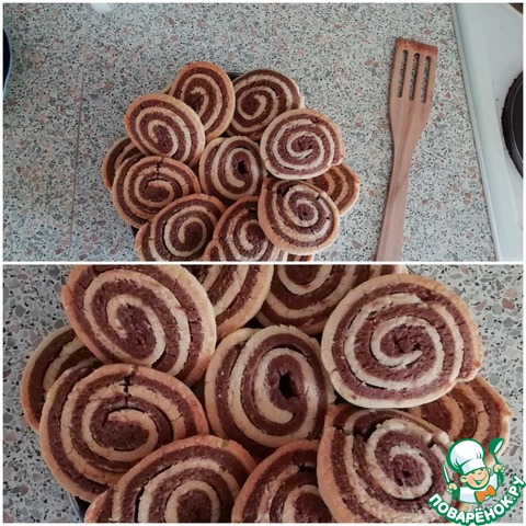 Я делала эти печенья с одним отличием. Если вы положите тeмное тесто на светлое, то рисунок получится с краю светлый, а в середине тeмный (у меня в розовой чашке).