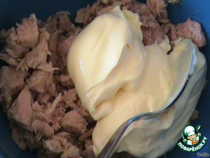Открыть тунец и слить масло (оно не нужно). Добавить майонез и растереть до однородной массы - вручную или миксером.