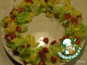 И пусть она там себе варится, на ме-е-едленном огне. А мы тем временем займемся гарниром. Овощи моем и режем. Помидор и болгарский перец небольшими кубиками, айсберг разбираем на листья и рвем руками на клочки. Укладываем на тарелку кольцом: слой айсберга, посыпаем его кубиками помидора и желтого болгарского перца. Получается вот такая красотень:
