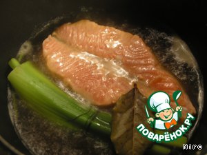 А мы тем временем быстренько ставим на плиту кастрюльку и... задумываемся над ней. В идеале припускать нашу рыбу нужно в крепком рыбном бульоне - фюме. Этот бульон должен долго варится из большого количества рыбьих костей, голов или мелкой рыбы, морковки, лука порея и шалота с добавлением белого вина, букета гарни и лимона. Как утверждает моя замусоленная книжка по французской кулинарии, "фюме должен быть в достаточном количестве у каждой уважающей себя хозяйки". М-да! Видать, не сильно я себя уважаю! Нет у меня его! (Хотя и рекомендую всем: этот бульон можно заранее сварить, процедить, разлить по емкостям, заморозить и использовать по мере необходимости. Оно того стоит!) Ну, нет, так нет! Обойдемся любым овощным бульоном. Что, и овощного нет? Ладно, заканчиваю издеваться!
