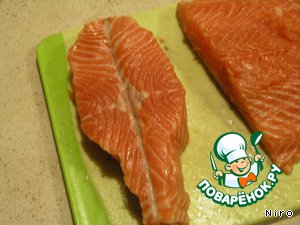 Отрезаем этакий умильный кусок, моем его, обсушиваем бумажным полотенцем и разрезаем вдоль, не прорезая кожи. Вот так: