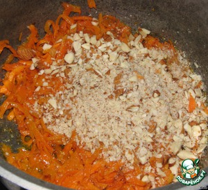 Трем морковь и пассируем на масле гхи. Мелко режем или трем на терке миндаль, добавляем к моркови и тоже немного обжариваем.