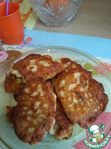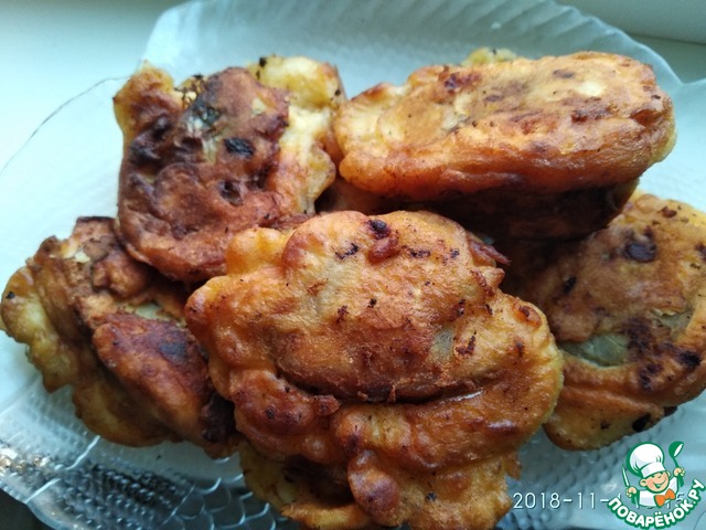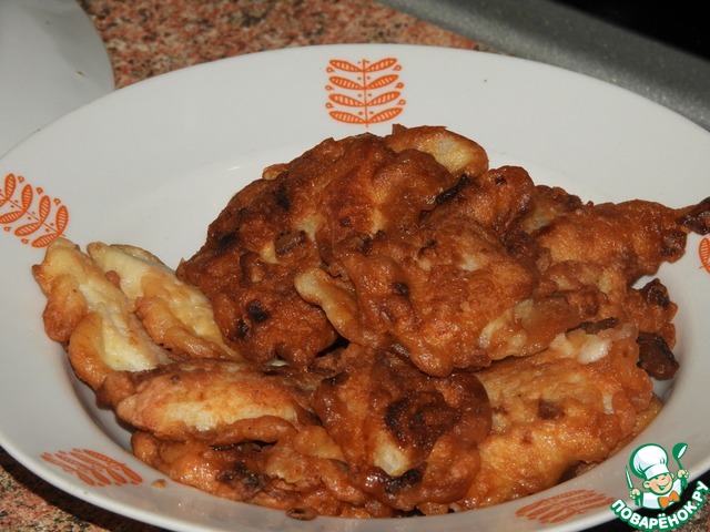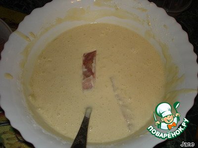 Все перемешать, постепенно добавляя муку. По густоте кляр должен получиться, как тесто на оладьи.