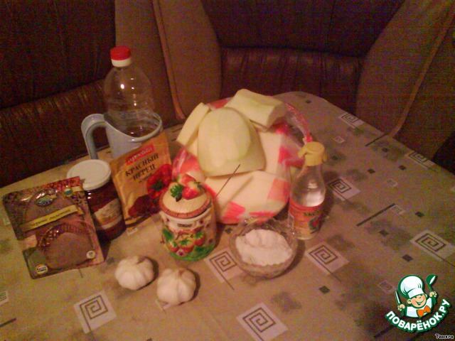 Отдельно смешать чеснок (я пропускаю через чеснокодавку), уксус, красный молотый перец, черный молотый перец.