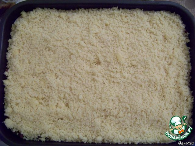 Смешиваем оставшиеся продукты – 150 гр муки, 75 г сахара, 70 г сливочного масла – в крошку, посыпаем ею творожный слой.