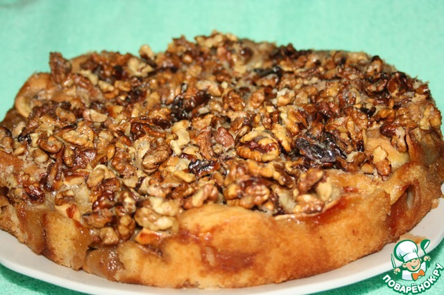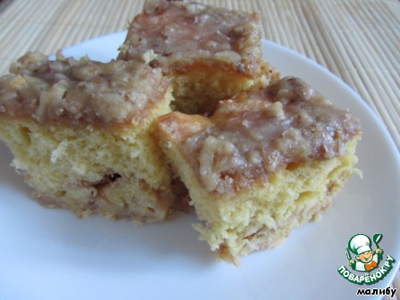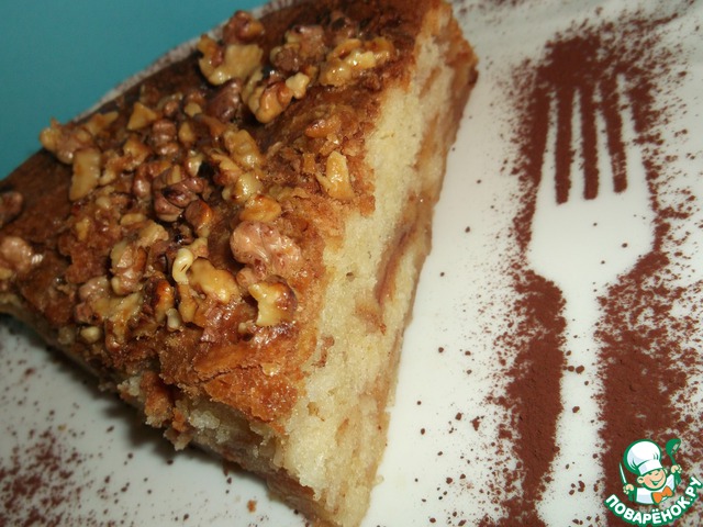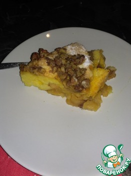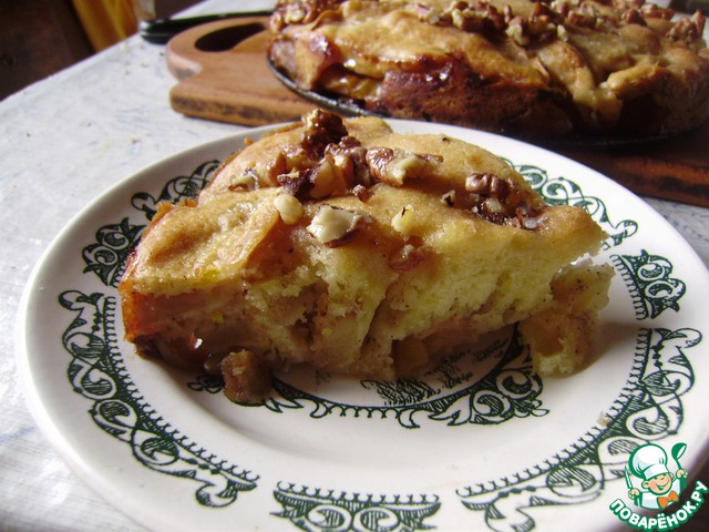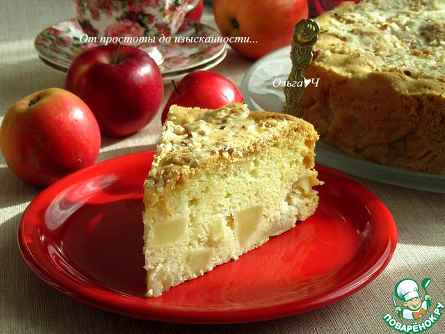 Основа-слой яблок, сверxу-слой теста, после выпекания заливается сливочно-ореxовой смесью, придающей пирогу неповторимый вкус. Слова не мои, а автора рецепта (бухгалтер София), но я с ними вполне согласна!!!