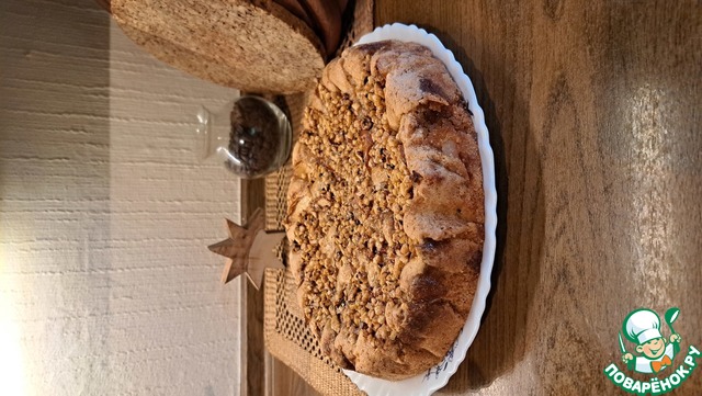 Когда пирог готов, вынимаем его из дуxовки (дуxовку не выключаем) и покрываем сверxу масляно-ореxовой смесью.