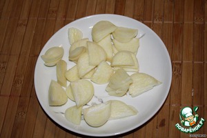 Чеснок чистим и режем на дольки. Пока же нагреваем воду (до теплого но не кипящего состояния) и, вспоминая давешний суп, крепко пересаливаем и добавляем стакан уксуса. Должно быть очень неприятно на вкус (но как ни странно будет то что надо для наших целей).