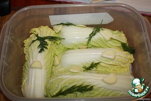 Перекладываем листики капусты с чесноком и укропом в какой нибудь удобной посудине. Посудина должна быть достаточна крупная, потому что свежие листики занимают много места (на первом этапе)