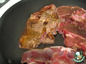 На раскаленной сковородке, без масла, обжариваем мясо на высоком огне, с обеих сторон придавливая лопаткой /по5 мин с каждой стороны/. Должна образоваться корочка это очень важно, т. к стягиваются волокна и мясо внутри останется сочным.