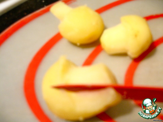 Мясо смазать смесью трав и отложить как минимум на 30 мин. тем временем варим картофель в мундире до полуготовности, остудить, очистить и вырезаем из них грибочки.