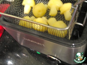 Во фритюрнице румянится картофель 5 мин далее отходы от грибочков из них получаются прекрасные чипсы, и в самом конце на 2 мин во фритюрницу опускаем помидорки с оливами.
