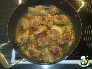 На большой сковороде обжарить немного мясо с обеих сторон.