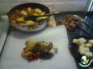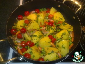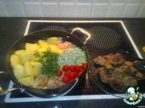 Переложить мясо в другую посуду и обжарить в том же масле нарезанный лук. Затем добавить горошек, картофель, помидоры, морковь, зелень.