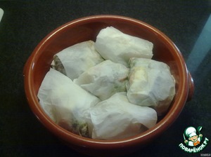 Теперь осталось сформировать перг.пакетики: для этого выложить на серединку несколько кусочков мяса, овощную начинку, 2-3 кусочка сыра. Завернуть в пакетик.