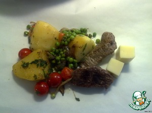Попробовала запечь мясо, картошечку и другие овощи в пергаменте (кальке). Результат был очень даже хорошеньким... Источник рецепта:моя кулинарная книга и свои изменения(на этот раз я не добавляла лимонный сок и добавила морковку).