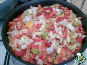 Пока варятся помидоры, лук и болгарский перец режем соломкой и обжариваем в 0,5стак. растительного масла до мягкости.